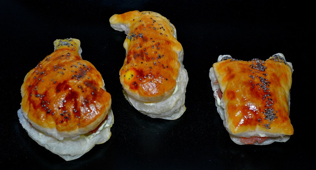 - Emulsionate il tuorlo dell’uovo con il latte e spennellate le forme di sfoglia. Cospargete coi semi di papavero secondo gradimento e “spirito artistico” !! 😉