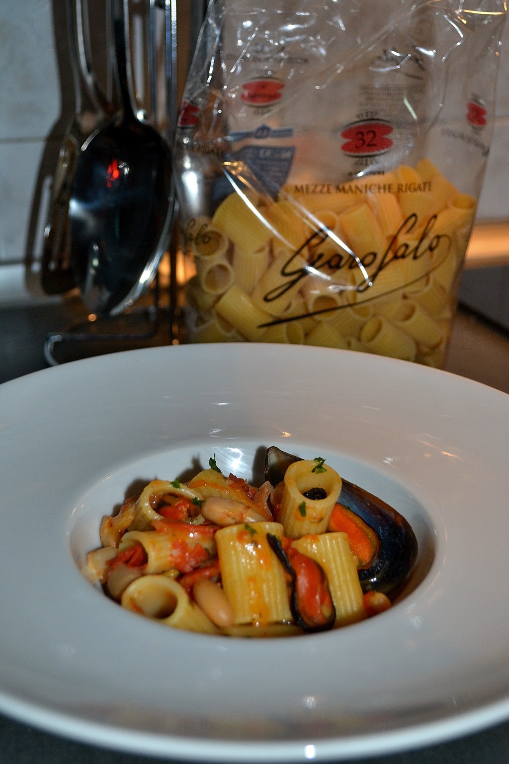 - A metà cottura, scolate la pasta ed aggiungetela ai fagioli; unite altro liquido delle cozze e portate a cottura coprendo col coperchio.