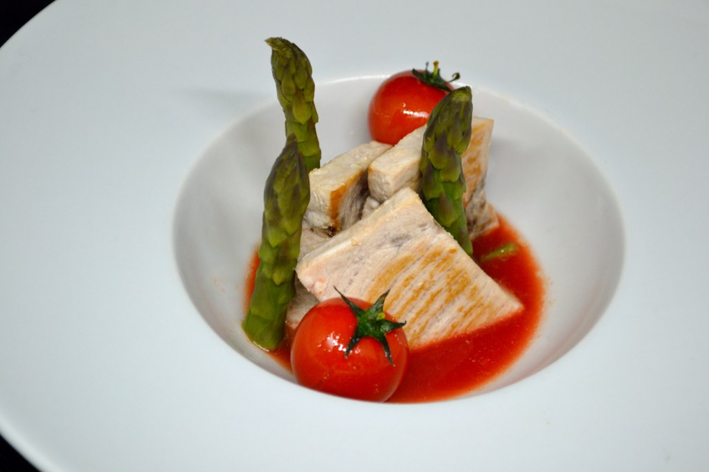 Infine, vi presentiamo il nostro secondo di stagione: dadolata di pesce spada con punte di asparagi croccanti e pomodorini confit nella loro acqua! Elegante e raffinato, un piatto per appagare il palato e l’occhio (già a descriverlo non vi invoglia a mangiarlo?!) .
