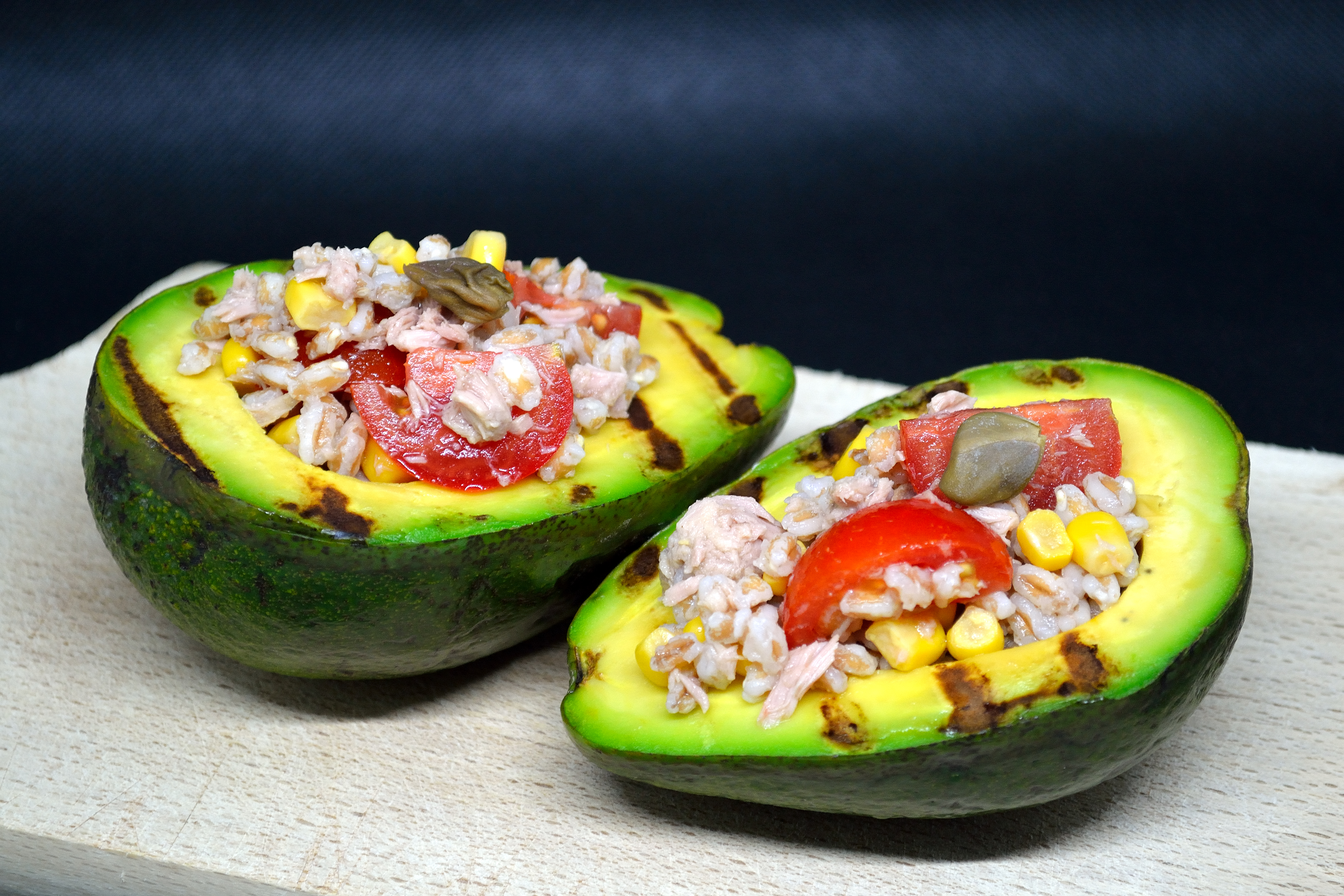 Oggi vi proponiamo un nostro must con l’aggiunta di un ingrediente in più: farro, tonno, mais e pomodorini…ed avocado arrostito, che è un qualcosa di spaziale!