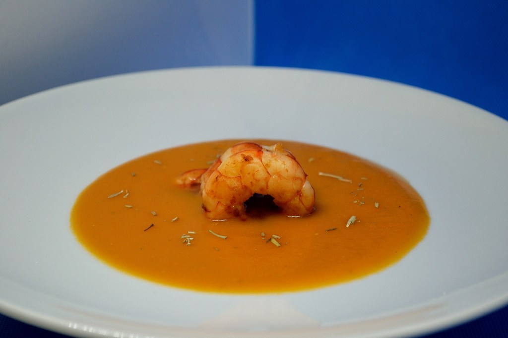 - Impiattate creando un fondo con la crema di zucca e adagiatevi sopra i gamberoni; finite con qualche foglia di rosmarino e buon appetito!!