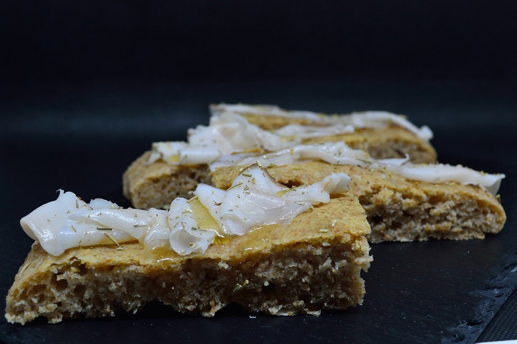 Noi abbiamo deciso di reinterpretarlo come focaccia (sarà l’influenza ligure 😉 ) : provate a sentirne l’aroma appena sfornata, fragrante e calda; immaginatevi di adagiarci sopra una bella fetta di lardo che inizia a sciogliersi ed a rilasciare il suo profumino; guarnite il tutto con del miele di acacia! Davvero irresistibile!