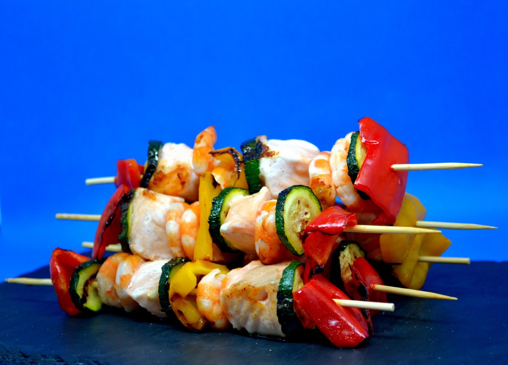 - Quando le verdure saranno tiepide, create i vostri spiedini alternando pesce, crostacei e verdure a vostro piacimento.