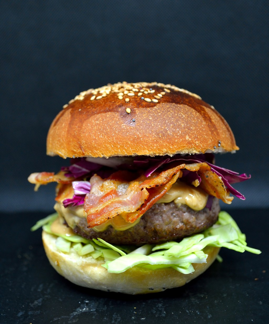 - Componete ora il vostro paninazzo: base del bun, strato di cavolo verde, hamburger, burro d’arachide, bacon (spezzato se troppo lungo), strato di radicchio e chiusura col top del bun. Buon foodporn all’ammericana a tutti (vale leccarsi le dita) !! 😉