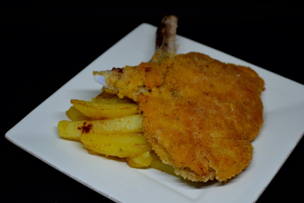Noi la presentiamo col contorno più classico in assoluto: le patate fritte cotte nello stesso burro della cotoletta così che ne assorbiscono il sapore. Ma anche un’insalatina ci starebbe benissimo (così da non esagerare con la fiera del “trigliceride libero” ; ecco che si consuma la rivincita del Fabry col suo più salutare olio EVO..zan zan 😉 ) .