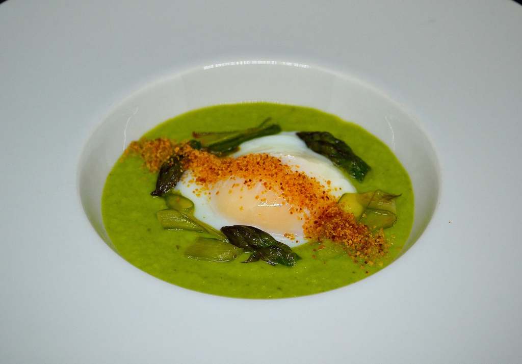 - Frullate il resto degli asparagi con 6g di olio allungando con l’acqua di cottura degli asparagi per ottenere una crema fluida; insaporite con pepe nero e sale.