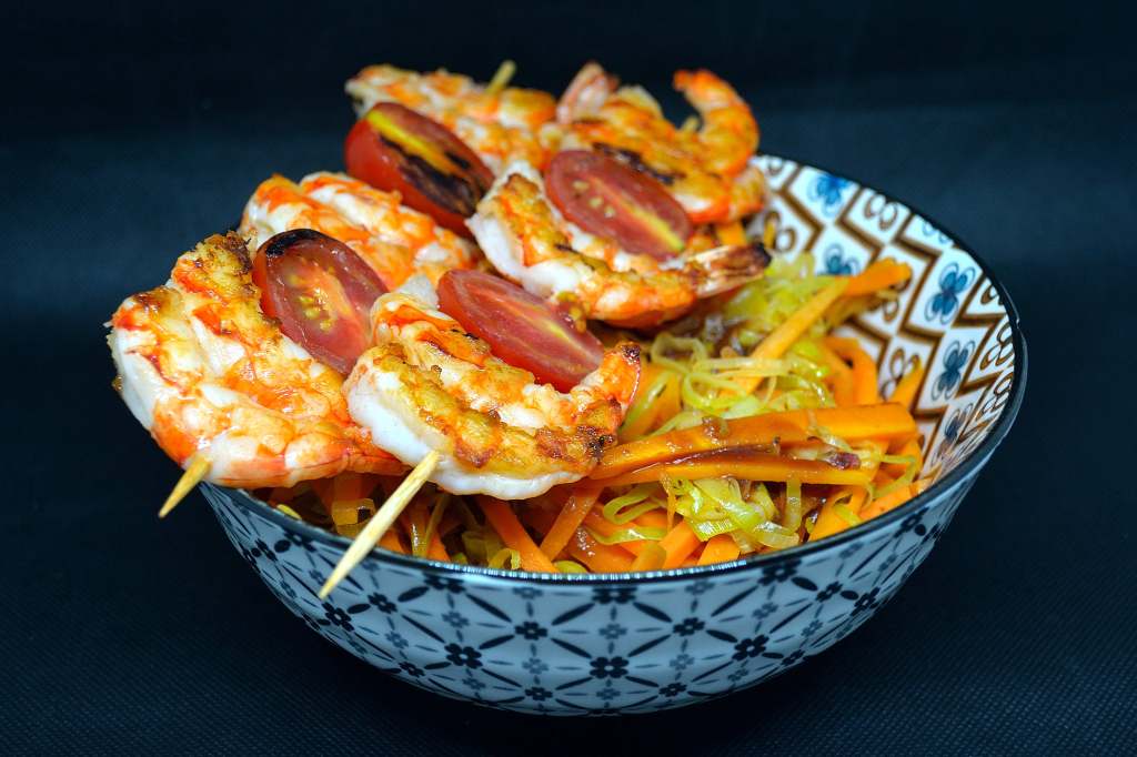 Semplici e gustosi, gli spiedini piacciono proprio a tutti. Quelli che vi proponiamo oggi sono in versione asiatica, e sono esclusivamente di gamberi e pomodorini. Vedrete che sapore! Il pasto ideale per affrontare il caldo di questo luglio particolarmente afoso. In più, saranno accompagnati da un’insalata tiepida di verdure davvero irresistibile.