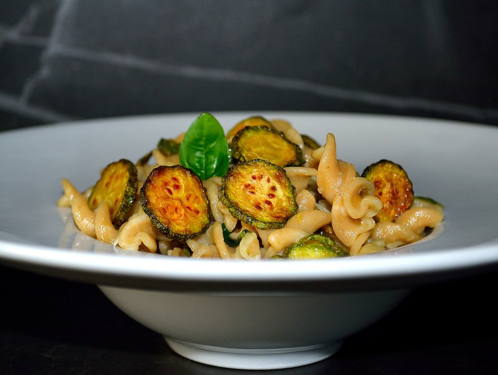 - Fate imbrunire uno spicchio d’aglio in camicia in 20g di olio usato per la frittura delle zucchine, levatelo e mantecate nella padella 2/3 delle zucchine, i fusilli ed infine aggiungete un mestolo di acqua di cottura della pasta e continuate a cuocere.