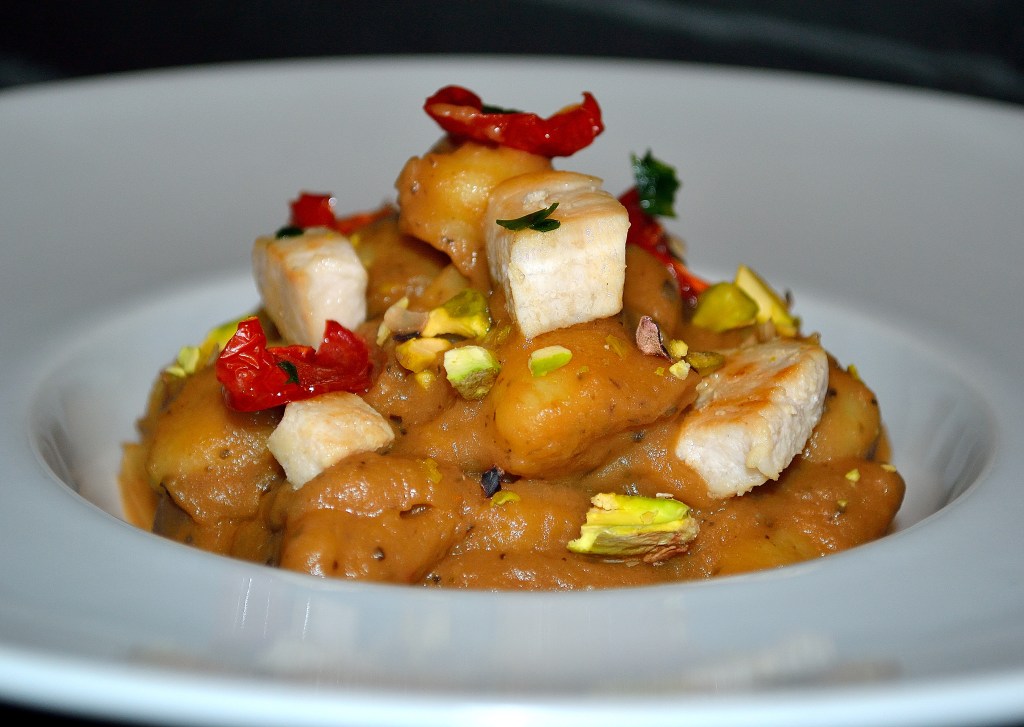 - Impiattate gli gnocchetti disponendovi sopra i tocchetti di pesce ed i pomodori confit; finite con del prezzemolo tritato, la granella di pistacchio e, se gradite, un giro di olio di oliva. Buon appetito!!