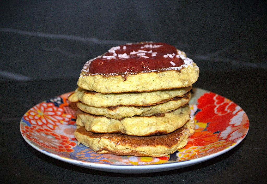 Valori nutrizionali (3 pancake per persona): kcal 297; fat 5g, cho 52g, pro 11g.