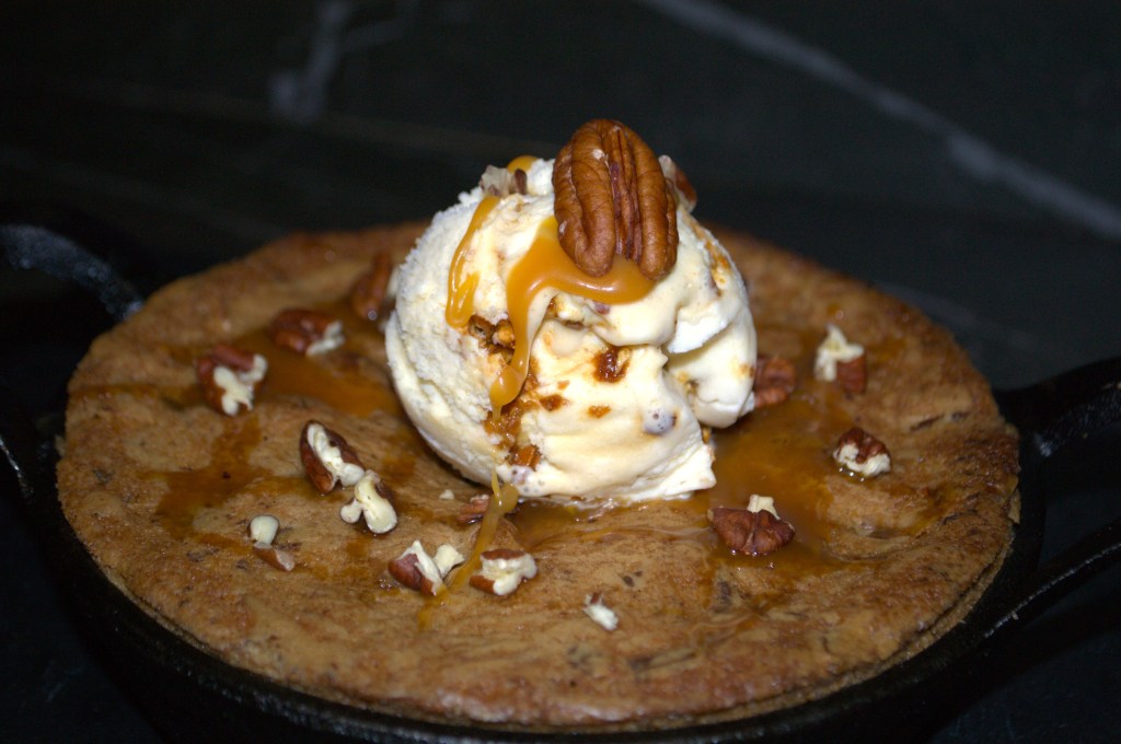 Questa è sicuramente una delle strade più facili per far felici i vostri invitati o per coccolarsi senza troppi sbattimenti. Lo skillet cookie è davvero fantastico: croccantino esternamente e morbido e goloso internamente: consistenza particolare e differente durante il morso, cioccolato fondente, noci pecan e caramello salato regalano un saliscendi di sapori e di sensazioni davvero notevoli per il palato.